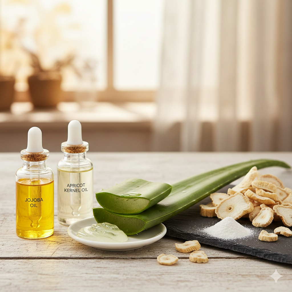 We utilize Jojoba Oil and Apricot Kernel Oil because they mimic the skin’s natural oils, allowing for rapid absorption and deep conditioning. Enriched with Aloe Vera and Astragalus Gum, this blend soothes dry areas and creates a breathable barrier against environmental stressors.*