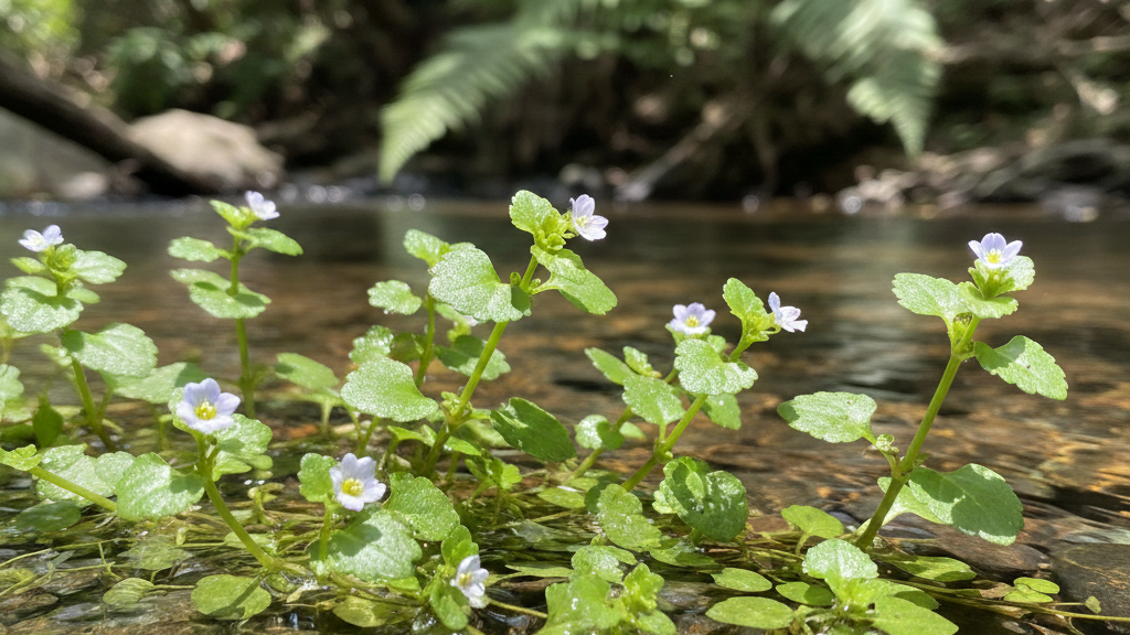 • Green leaves and small flowers with a stream and sunlight filtering through the trees in the background